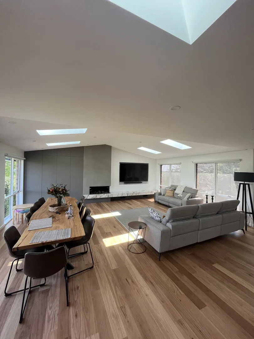 The job involved upgrading the floors from tiles to black but veneer timber supplied by WR Timbers. Additionally we installed floor to ceiling cabinetry, a gas fire place, changed the roof from tiles to colorbond roof sheets, insulated the ceilings throughout and upgraded the heating and cooling systems.